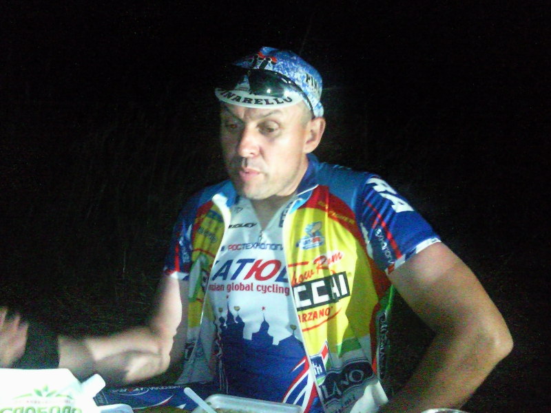 Пришлось тошнить самим. Это был самый тяжелый участок бревета, мы еще до Суджи потеряли весь с трудом набранный запас по времени, а теперь потеряли резервный час, отложенный на отдых в Глушково, и в дальнейшем, чтобы оставаться в пределах 36 часов, мы должны были использовать время, отведенное на сон на КП. Но и ехать без отдыха, после 35 км против ветра, по жаре и убито-расплавленному асфальту мы не могли. Поэтому, после некоторых раздумий, решили остановиться в Глушково у моих родственников, но по-минимуму. Мы даже ролтон купили, чтобы не тратить время и не поддаваться соблазнам. Уложились в 40 минут, умыться, ролтон и чай. Ну вы понимаете, да? Только рандоннеры ездят в гости к родственникам в Глушково через Мантурово, со своим ролтоном. Причем Леша даже поспать успел :)